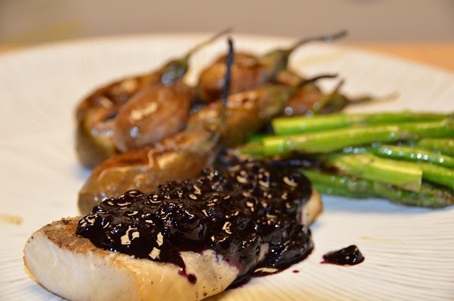 Put oil on your mahi fillets and salt & pepper them. Do the same with the veggies. Let them sit. Turn on your grill and let it heat up for 15 minutes or so. Meanwhile, put the blueberries, lemon juice and honey in a small sauce pan. Cook on medium heat until it starts to break down. With a spoon press down on some of the berries to make them less round. Stir frequently until the sauce thickens then stir in a pinch of salt and pepper. Throw you fish and veggies on the grill (4-5 minutes a side for the fish, just a hair less time for the vegetables, but flip them every so often). Then drizzle the blueberry sauce on the fish. You may need to add a bit of water to the sauce if it gets too thick, but don’t worry, the berries are so flavorful, you won’t water down the flavor at all! Then mix in the chopped fresh mint with the heat off. Everything onto a plate and voila! Couldn’t be easier!