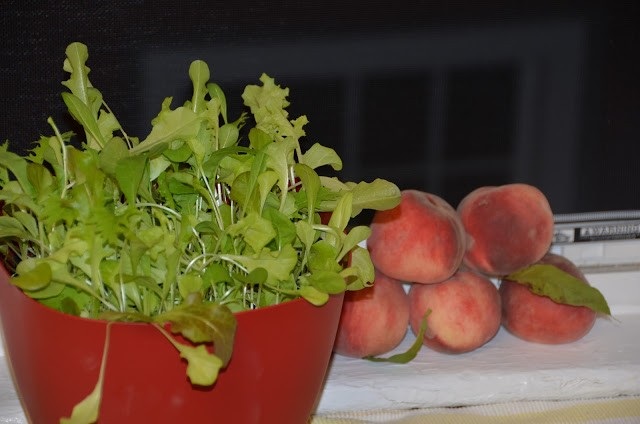 Moments prior to this conversation I picked up 6 white peaches from Kimball Farms. If that’s not a sign from a great power, I don’t know what is. Thank you food gods for directing me! So a couple days later I made grilled pork chops with grilled peaches and baby greens. THE BABY GREENS I’VE BEEN GROWING IN MY WINDOW!
