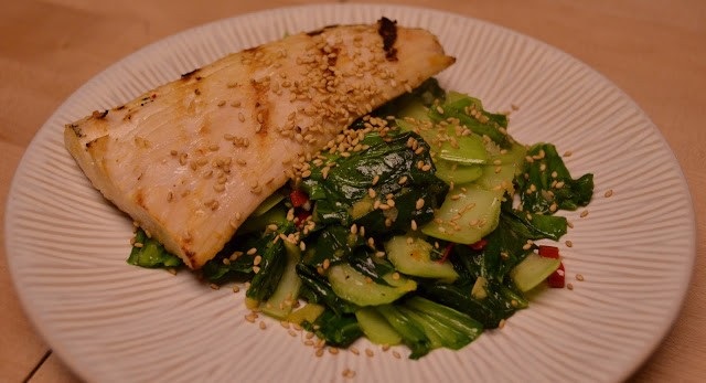 Melt coconut oil in a skillet over medium-high heat. Add garlic, ginger and cayenne peppers. Sauté for 2-3 minutes until aromatic, but not so long that you brown the garlic. Toss in the bok choy and crank the heat up to high. Sauté until the bok choy is wilted about 5 minutes. Add the bok choy to your plate and place the fish on top. Then sprinkle lightly with sesame seeds. I had it with a little extra of the mustard on my plate to dip the fish in, but I like spicy more than the average bear, so you might want to skip that!