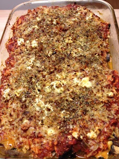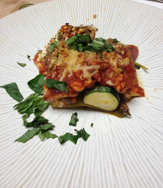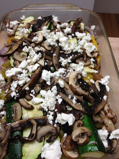 Cook all the vegetation as prescribed above. After you brown the ground turkey breast, mix it in with the spaghetti sauce and simmer until warm. Then start layering it all up. I went in this order: summer squash, kale, onion, 1/2 the parmesan, roasted yellow pepper, zucchini, mushrooms, 1/2 goat cheese, meat marinara sauce, rest of the parmesan and goat cheeses, dried herbs. Then bake uncovered in a 350 degrees oven for 35 minutes. Turn the heat up to 450 degrees and bake for an additional 10 minutes. Top off with chopped fresh basil and serve.