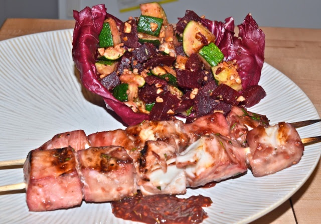 Melt the coconut oil over medium low heat and add rosemary. Infuse the oil slowly. When it gets fragrant (2 min or so) add the zucchini and crank up the heat. Toss it around initially then leave it alone for a few minutes to brown slightly. Then toss it again and repeat. In a separate pan, sauté the beets slightly to get them hot, but not to brown. Put all of this in a bowl with the almonds and toss gently so as not to dye the zucchini red! I served it in a radicchio cup for looks! But it’s great either way. The almonds really really change the consistency and the flavors marry well!